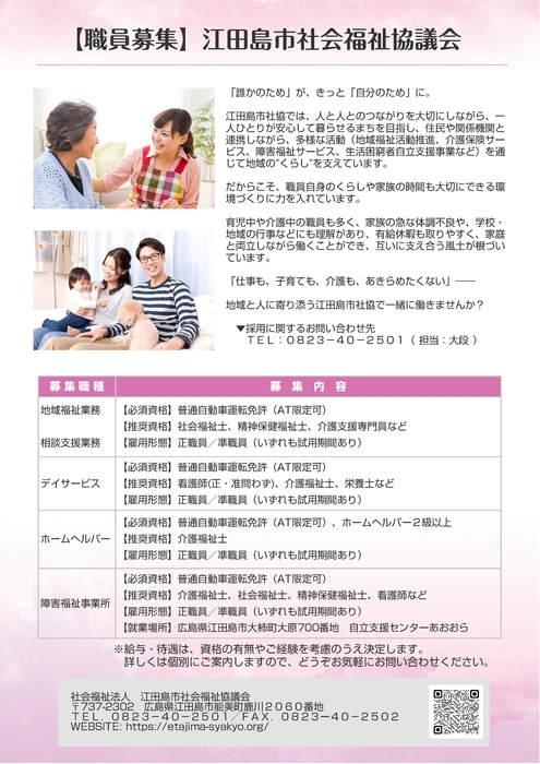 募集要項RECRUITMENT REQUIREMENTS 職員募集・職員紹介 デジタルカタログ お問い合わせCONTACT ●●● 採用に関するご相談やお問い合わせはお気軽にお寄せください Tel.0823-40-2501